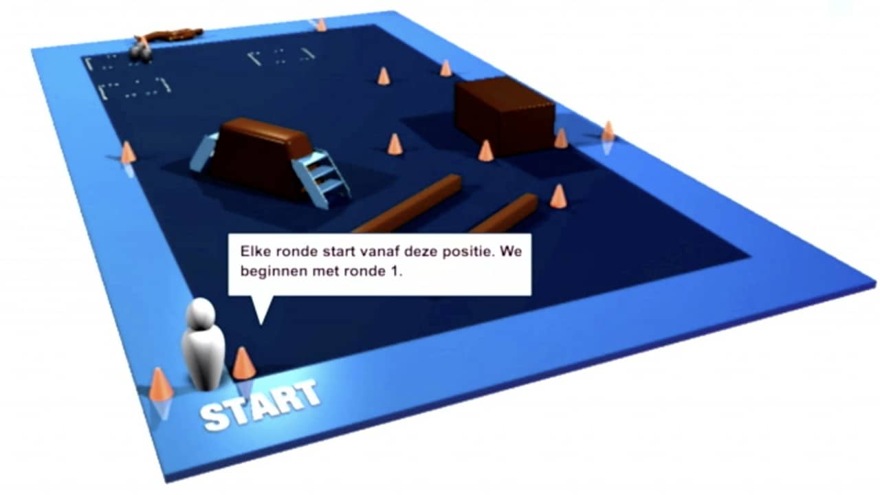 (Dan verschijnt: Duw de kar en zet deze gecontroleerd stil bij de pion. Verplaats de drie medicine ballen eerst naar dit vak. En dan nog eens naar dit vak. Ren dan terug naar start voor de tweede ronde.)
